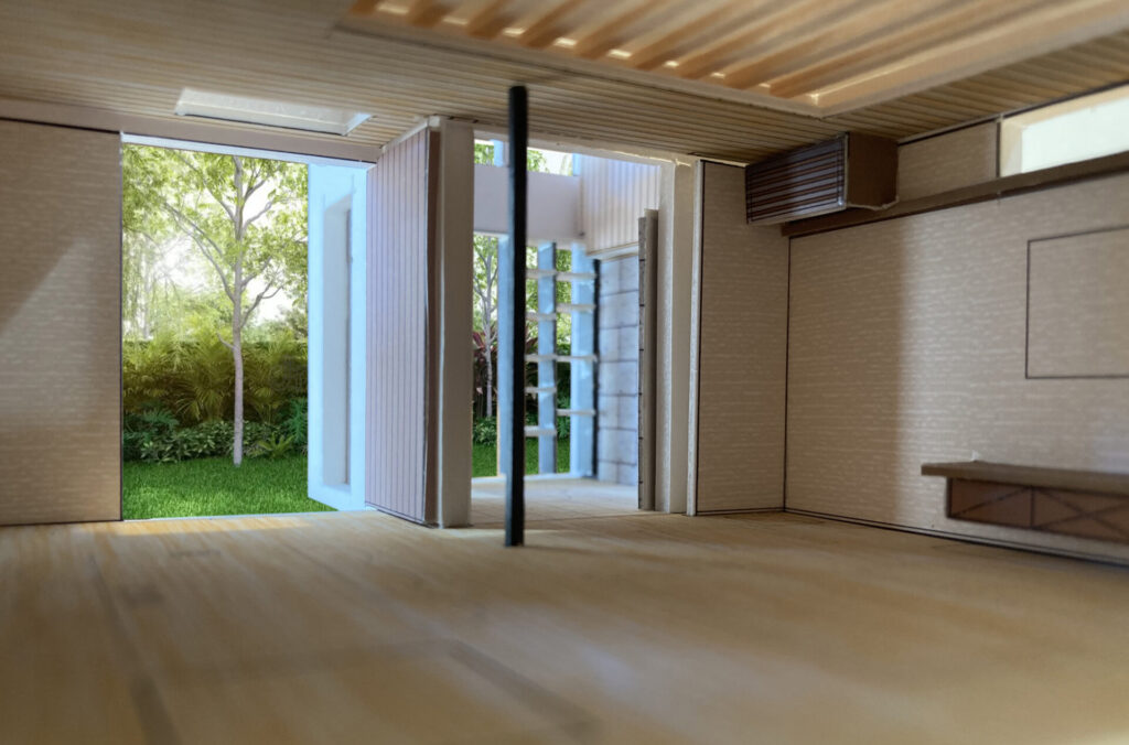 この報告書をもとに、断熱性能や太陽光の規模は決定され、お客様のテイストにあわせて実施設計を重ねていきました。下はそのリビングです。