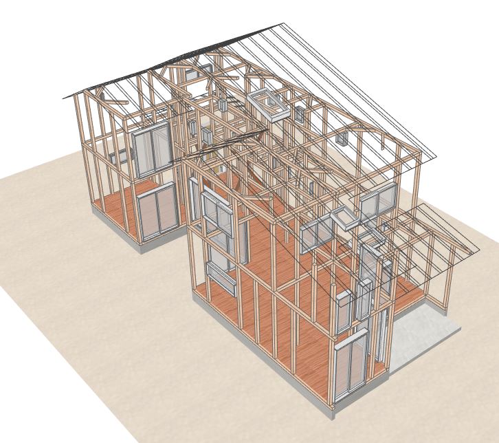 上の構造モデルは基本設計のときにつくったものです。お客様とのお約束で耐震等級3を確認するためです。